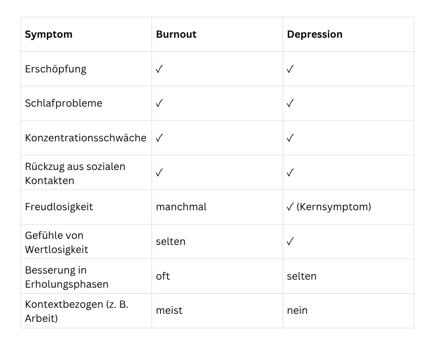 Entscheidend beim Burnout: Die Erschöpfung ist oft kontextbezogen. Im Urlaub oder abseits des belastenden Bereichs kann die Stimmung sich deutlich aufhellen. Das ist ein wichtiger Hinweis – denn bei einer Depression ist das anders.